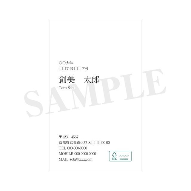 環境に配慮したSDGsな名刺、「FSC認証名刺」を学生様向けにお求めやすい価格・枚数でご提供いたします。 就職活動はもちろん、サークルやボランティア活動等で学外の方と接点を持つ際のご挨拶に。 用紙:ニューVマットホワイト サイズ:55 × 91 mm ( 91 × 55 mm ) カラー:フルカラー ※ご注文前に必ずお読みください。---------------------------------------------- ●ご注文の確定前に数量にお間違えがないか、今一度ご確認ください。 ●当製品は基本、お客様にデータをご提供いただき制作いたします。 以下の記入用テキストをコピーし、必要事項をご記入の上メールにてお送りください。 データをお持ちの場合は、メールに添付して弊社へ直接お送りください。 (ai/pdf推奨、jpg/png可) <記入用テキスト> 大学名 : 学部・学科名 : 肩書 : 名前 : ローマ字 : 郵便番号 : 住所 : TEL : FAX : Mobile : E-mail : URL : その他ご希望の記載情報: ●弊社でFSC認証マークをデザインに入れる作業がありますので、いただいたデザインから多少変更になる場合がございます。 仕上がりデータはメールでお送りします。 お返事いただけましたら印刷作業に入らさせていただきます。 ●大学名等を入れない名刺をご希望の場合は、学生証のご提示をお願いする場合がございます。 ●製品の特性上、手続きから発送までに10日程度お日にちをいただきます。 ●商品完成後は普通郵便にて発送させていただきます。 ●その他ご希望・ご要望は、事前にお問い合わせの上ご相談ください。